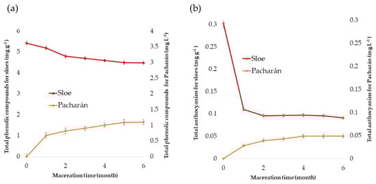 With respect to sloes, a decrease in their concentration of total phenolic compounds and anthocyanins can be observed, since they have been transferred to the “Pacharán”. As aforementioned, in the case of the anthocyanins, such a decrease is less marked after the first month.