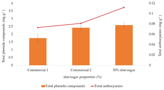 In the same way as “Pacharán”, the total phenolic compounds and the total anthocyanins present in different types of sloe jams were analyzed. The results are shown in Figure 9. It can be observed that the concentration of total phenolic compounds and anthocyanins in commercial jams is lower than that in handmade jam. This may be due to the degradation of these bioactive compounds due to the length of time and the storage conditions of commercial jams.