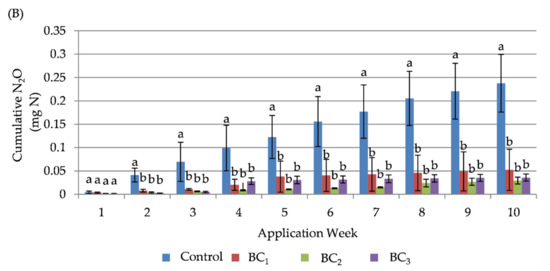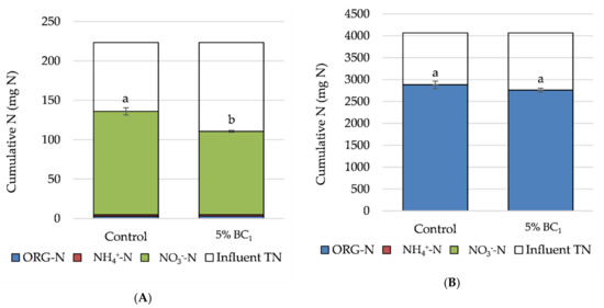 Cumulative (A) NO3−-N leached and (B) N2O emitted from columns receiving NO3−-N applications. Different letters signify significant difference (p < 0.05) between control and biochar treatments. Error bars represent standard deviation between treatment triplicates.