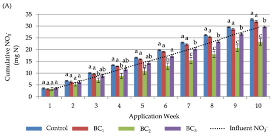 For columns receiving weekly applications of NO3−-N (treatment group 5), BC2 and BC3 reduced the NO3−-N leaching by 24.8% and 8.8% compared to the control column, respectively. There was no significant difference between control and BC1 (Figure 5A). The soil NO3−-N concentrations significantly increased for BC2 compared to other treatments (Table 2), and the mass retained accounted for the entire difference between N leached through BC2 verses the influent. For BC2, 7.9% of the total influent N applied was lost as N emission other than NH3 and N2O. All biochar treatments significantly reduced N2O emissions compared to control columns, but there was no significant difference between biochar treatments (Figure 5B).