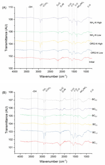 Fourier-transform infrared spectroscopy (FTIR) spectra of (A) BC1 initial and final for treatments 1 through 4, and (B) BC1, BC2, and BC3 initial and final for treatment group 5.