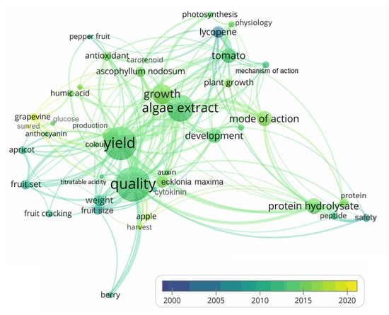 As expected, quality and yield are the main terms. “Algae extracts” and “protein hydrolysates” are the main plant biostimulants used in the research concerning fruit quality. “A. nodosum” and “E. maxima “are the algae investigated concerning fruit quality. “Tomato” is the main crop, although “pepper”, “grapevine”, “apple”, “berry” and “apricot” are also displayed. Among fruit attributes, “antioxidant” and “weight” are the main terms. The term “growth” is related to fruit growth and distinguished from “plant growth”, thus indicating that it has been a critical trait evaluated in fruit quality. The newest publications were with “grapevine” and “apple”, but “mode of action” also appears in the recent literature, indicating an effort to understand how plant biostimulants improve fruit quality. “Auxin” and “cytokinin” have been related to “mode of action”. It is also interesting to observe that “mode of action” was more strongly related to “algae extract” than “protein hydrolysate”. The “mode of action” of plant biostimulants has been more studied than “mechanism of action”. The term “safety” is not strongly linked to “quality”, thus indicating a hiatus in the fruit quality × plant biostimulant research.