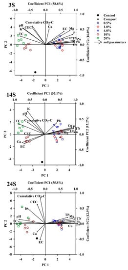 Principal component analysis, based on soil chemical characteristics and cumulative CO2-C after 100-d incubation period, in 3S, 14S and 24S soils treated with 0% (control), compost (2%), and 0.5%, 1.0%, 4.0%, 10% and 20% of RHB.