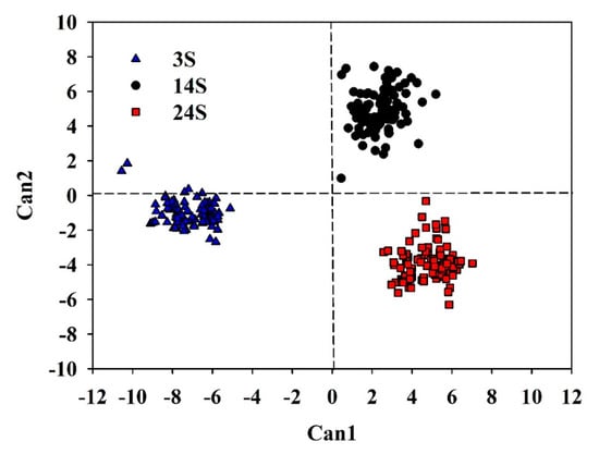 Canonical scores of the first two canonical discriminant functions (Can) of 3S, 14S and 24S soil.