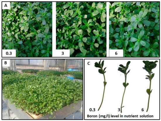 Wild (A) and commercial (B and C) purslane (Portulaca oleracea L.) cultivated with three different levels of Boron in nutrient solution.