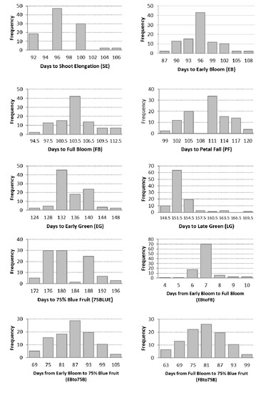 Distributions of the various growth stage traits are illustrated in Figure 1. As can be seen in Table 1 and Figure 1, bloom (EBtoFB) occurred over a short period of time (a mean of 6.6 days) in this population. Fruit ripening (~45 days from mean of EG to mean of 75BLUE) occurred over a much longer period of time. The mean time of SE (96.7) was approximately the same as the mean time of EB (96.1). PF occurred ~7–8 days after FB. EG was ~25 days after PF, LG was ~19 days after EG, and 75BLUE was ~28 days after LG. From EBto75B was a mean of 85.4 days, with a range of 68–107 days.
