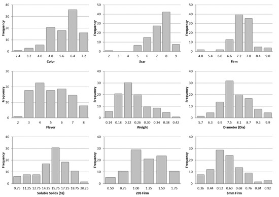 Chi-square likelihood ratio tests (LRTs) in the diploid blueberry population indicated that there was significant variation across the genotypes for all of the fruit quality traits except for Flavor and 20S (Table 1). In addition, four of the fruit quality traits exhibited significant variation across years (Color, Scar, Weight, Dia), while five did not (Firm, Flavor, SS, 20S, 3 mm) (Table 1). Distributions of the various fruit quality traits are illustrated in Figure 2.