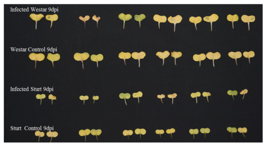 In this study, the sampling was a crucial step as we needed to select a time point at which disease symptoms were clearly distinguishable between resistant and susceptible cultivars before cotyledons died due to aging. The infection symptoms were monitored daily after the inoculation and after 9 days of inoculation (dpi) despite the cotyledons of both cultivars turning yellow as a result of aging; the infection symptoms (necrotic lesions) were clearly recognizable in the susceptible cultivar (Westar) but not in the resistant cultivar (Sturt) (Figure 1). If the experiment proceeded for more than 9 dpi, all cotyledons in both cultivars were dead and the infection symptoms were not recognisable.