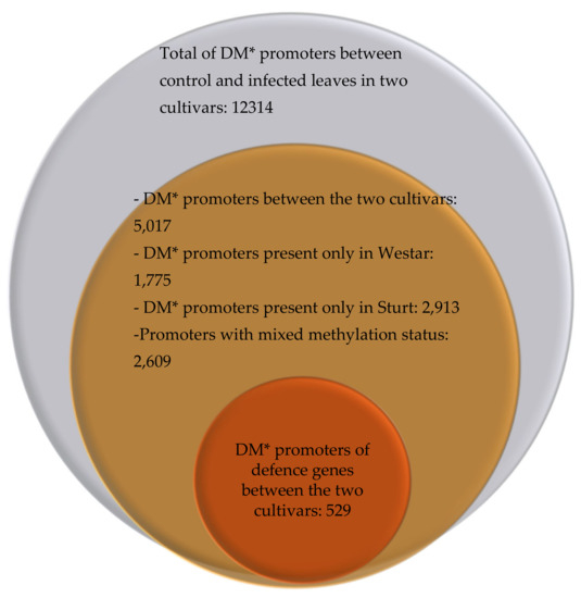 Total number of differentially methylated promoters between leaves from control plants and leaves from infected plants with Leptosphaeria maculans of B. napus cultivars Westar (susceptible) and Sturt (resistant). *Differentially Methylated.
