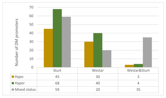A total of 62,583 and 58,100 promoters had enough coverage in Sturt and Westar, respectively, and used for downstream analysis. The comparative analysis between control samples and samples infected with pathogens in both cultivars shows a total of 12,314 promoters were differentially methylated between control and infected samples in both cultivars (Table S1). Out of these 12,314 promoters, 5017 (40.74%) were differentially methylated between Sturt and Westar; 1775 (14.41%) and 2913 (23.65%) were differentially methylated only in Westar and Sturt, respectively; and 2609 (21.2%) promoters had mixed methylation status (i.e., in some of the leaves they were hypo-methylated and in some leaves hyper-methylated) (Figure 2). These observations suggest that in the resistant cultivar Sturt, the occurrence of DNA methylation modification is more dynamic under pathogen attack as more promoters (2913) were differentially methylated between mock and infected samples in comparison to the susceptible cultivar Westar (1775) (Figure 2). There are many studies that also present the plasticity of the occurrence of DNA methylation in response to biotic and abiotic stresses. For example, a genome-wide DNA methylation study in Medicago truncatula under salinity stress shows DNA methylation modification is occurring in different regions of genes with a potential role in salt tolerance responses [36] and there is occurrence of DNA methylation modification in different regions of genes in B. rapa in response to the pathogen Fusarium oxysporum f. sp. conglutinans [37].
