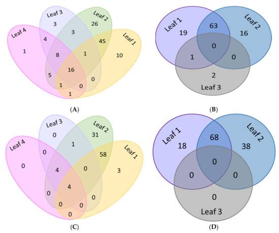 Venn diagram of the numbers of differentially methylated promoters of defence genes between leaves from control plants and leaves from infected plants with Leptosphaeria maculans of B. napus cultivars Westar (susceptible) and Sturt (resistant). Hyper-methylation in Sturt (A) and Westar (B); Hypo-methylation in Sturt (C) and Westar (D).