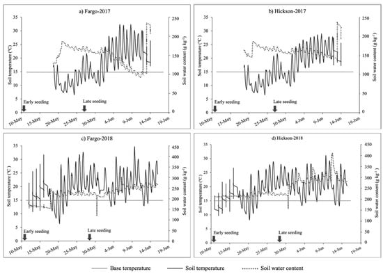 Soil temperature and soil water content from planting to the end of emergence at four environments at (a) Fargo 2017, (b) Hickson 2017, (c) Fargo, 2018, and (d) Hickson 2018, ND, USA.