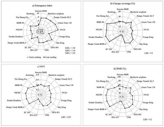 (a) Mean emergence index at early and late seeding, and (b) mean canopy coverage at 46 days after seeding (DAS), (c) mean normalized difference vegetation index (NDVI) evaluated at 49 DAS, (d) mean intercepted photosynthetically active radiation (IPAR) evaluated at 58 DAS in forage sorghum genotypes averaged across two seeding dates and four environments in Fargo and Hickson, ND, USA, in 2017 and 2018. Least significant differences (LSD1) to compare among genotypes within the same seeding date, LSD2 to compare same genotype between different seeding date, LSD3 to compare among genotypes on different seeding dates, LSD in Figure 3b–d are to compare among genotypes-mean averaged across seeding date within the same figure.