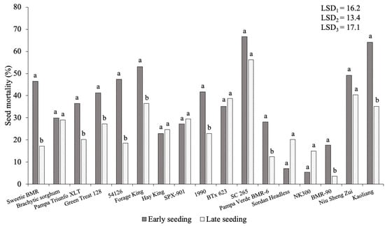 Mean seed mortality rate in forage sorghum genotypes planted on two seeding dates averaged across four environments at 20 days after each planting in Fargo and Hickson, ND, USA, in 2017 and 2018. Least significant differences (LSD1) to compare among genotypes within the same seeding date, LSD2 to compare same genotypes between different date and also different small case letters show significant differences, LSD3 to compare among genotypes on different seeding date).