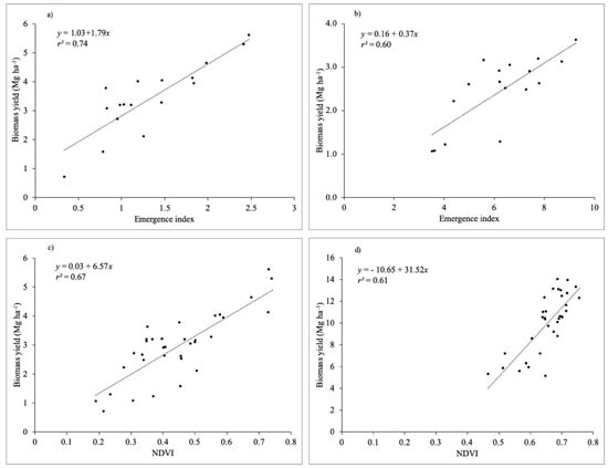(a) Emergence index vs. biomass yield for early-seeding at first harvest, (b) emergence index vs. biomass yield for late-seeding at first harvest, (c) normalized difference vegetation index (NDVI) at 49 days after seeding (DAS) vs. biomass yield for first harvest, and (d) NDVI at 20 days after harvest (DAH) vs. biomass yield for second harvest in forage sorghum genotypes (G) averaged across four environments, Fargo and Hickson, ND, USA, in 2017 and 2018.