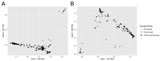 Soil microbial community analysis revealed strong, but inconsistent, effects of drought phase (pre-drought, peak drought, and post-drought recovery) on community composition, as shown by principal coordinates analysis (PCoA) generated from weighted UniFrac distances (Figure 1). However, there were no discernable differences in bacterial or fungal composition when distinguished by drought tolerance groups (Supplemental Figure S3). PERMANOVA of beta dispersion indicated a significant (p < 0.001) difference in UniFrac distance for drought phase, but not for drought tolerance (p = 0.77). The same pattern holds true in fungi with significant differences between drought phases (p < 0.001), but not between tolerance groups (p = 0.31) [43]. There is greater variability in samples during the pre-drought and peak drought stages, but a convergence of the overall bacterial OTU fingerprint of the different drought tolerance genotypes upon post-drought recovery, as indicated by the solid black circles on the PCoA plots (Figure 1A). Fungal patterns were similar, but with a reduced convergence of recovery samples (Figure 1B). The similarity in community structure between drought tolerance levels is supported by DESeq2 analysis of differential abundance. No bacterial or fungal taxa significantly differed in abundance between drought tolerance groups after correcting for multiple comparisons.