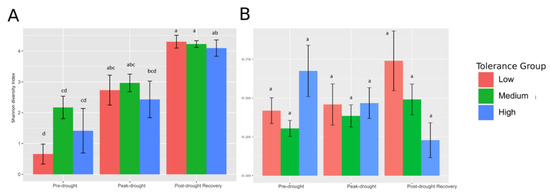 Shannon Diversity of Bacterial and Fungal Communities. Histograms of mean Shannon Diversity Indices at pre-drought, peak drought, and post-drought recovery stages for (A) bacteria and (B) fungi. Coloring denotes drought tolerance groups ‘Low’ (Red), ‘Medium’ (Green), and ‘High’ (Blue). Connecting letters denote significant difference at alpha-level 0.05 and are unique to each (A) and (B).