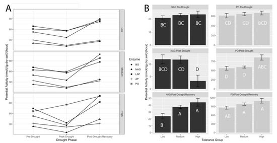Comparisons of potential extracellular enzyme activities of five different enzymes revealed a general trend of declining activity from pre-drought to peak drought, and a rebound during post-drought recovery (p < 0.05) (Figure 3A). This trend was more pronounced in the Medium and High tolerance groups, with N-acetyl glucosaminidase (NAG or chitinase), leucine aminopeptidase (LAP), beta-glucosidase (BGC), and phenol oxidase (PO) all recovering to significantly greater activities than in the pre-drought period. Phenol oxidase showed a significant increase in activity levels by drought tolerance groups (p < 0.05), with the most drought tolerant genotypes exhibiting the highest potential activities during peak drought (Figure 3B). Chitinase activity levels were significantly greater in the medium and high tolerance groups compared to the drought susceptible genotypes during the post-drought recovery stage and the highest tolerance fescues showed the most dramatic recovery from peak-drought to recovery.