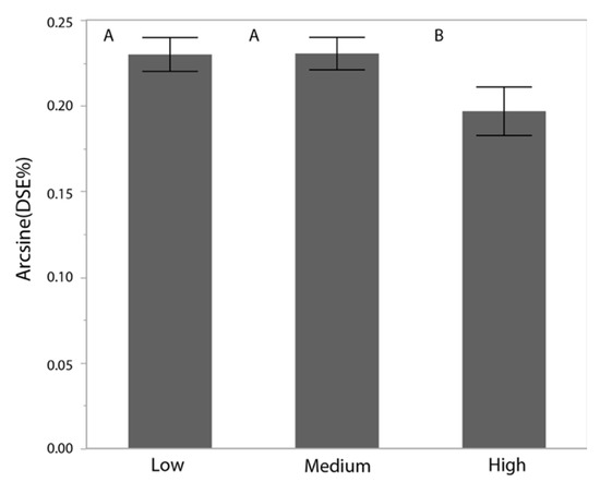 The DSE infection rate was lowest in the high drought tolerance genotypes (Arcsine-transformed DSE% 0.196 ± 0.02 SE). Higher infection rates were found in the low- and medium- drought tolerance groups (Arcsine-transformed DSE% 0.23 ± 0.01 SE) (Figure 4).