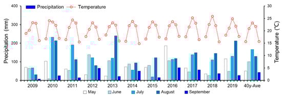 Monthly average air temperature and precipitation during the maize growing season over 11 years from 2009 to 2019 and for the 40-year averages (40y-Ave) at Lishu county, Northeast China.