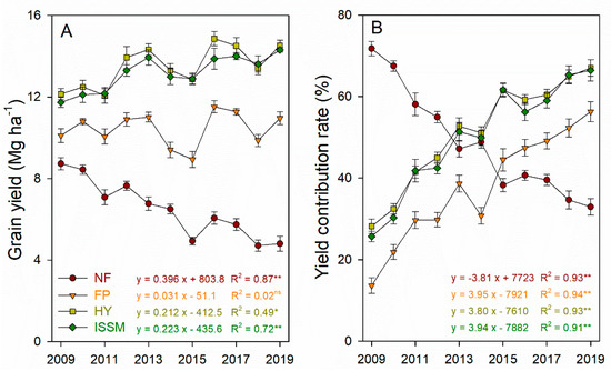 Maize yield showed contrasting changing trends among the various treatments during the experimental periods (Figure 2). Grain yield in the NF treatment was the lowest across all years, and showed a continually decreasing trend from 8.7 to 4.7 Mg ha−1. The total yield reduction during the study period for NF was 45%, with an annual reduction rate of about 0.4 Mg. Correspondingly, the yield contribution rate from soil (YCRS) decreased continually from 72% in 2009 to 33% in 2019, suggesting considerable soil fertility consumption by maize plants under the unfertilized condition. Across all the years, grain yields in the fertilization treatments were significantly higher than that in NF (p < 0.01). The YCRF in the three fertilization treatments showed continually increasing trends and exceeded the YCRS after 2014, eventually reaching 56–67% in 2019. The FP maintained grain yield between 8.9 and 11.5 Mg ha−1 with an average of 10.4 Mg ha−1, and it showed no significant yield trend over years with a yield change of only 0.03 Mg year−1. The HY and ISSM treatments had no yield differences (p > 0.05) in each year; however, both obtained significantly higher grain yields (p < 0.01) than the FP treatment across all years. Moreover, both the HY and ISSM treatments showed continually increasing yield trends, also with a similar rate of increase of about 0.2 Mg year−1. On average over the 11-year study period, grain yield in ISSM (13.2 Mg ha−1) achieved 97.7% of that in HY (13.5 Mg ha−1), and it was increased by 27% relative to FP. Moreover, grain yield in ISSM concurrently showed the maximal SI (0.86) and minimal CV (6.6%) over years as compared with HY (0.84 and 7.5%) and FP (0.83 and 7.9%), indicating that the ISSM had better sustainability and stability in producing high maize yield.
