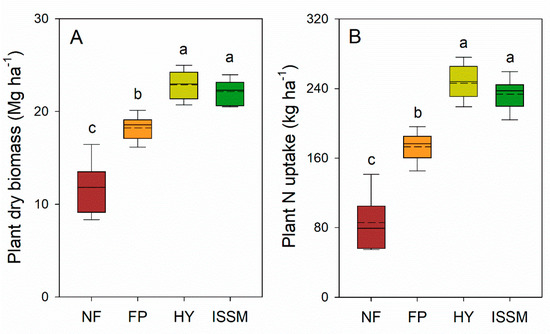 Maize plant dry biomass (A) and nitrogen (N) uptake (B) at maturity over 11 years among the different treatments. Different letters above the boxes indicate significant differences among treatments at p < 0.05.