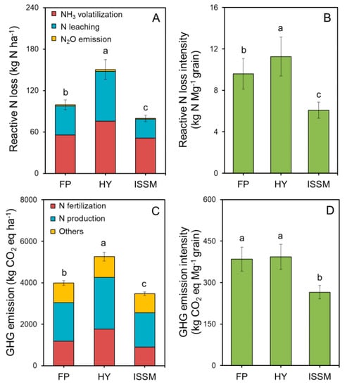 Annual averages of reactive nitrogen (N) losses (A) and greenhouse gas (GHG) emissions (C) and the intensity per unit grain yield (B,D) over 11 years among the different treatments. Different letters above the bars indicate significant differences among treatments at p < 0.05.