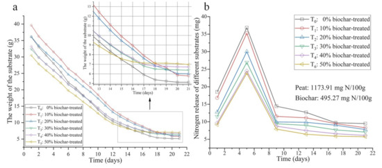 As shown in Figure 1b, the nitrogen release of the substrates first increased and then decreased along with the increasing of seedling raising days, and the nitrogen release decreased obviously with the increase of biochar content. The nitrogen release of the substrates reached the maximum value on the 5th day, and gradually decreased to a stable level. The nitrogen release of the substrates with T0 and T1 treatment was much more than others, but the nitrogen release of the substrates with T4 and T5 treatment was the least compared with others. The reason was that the biochar had a large specific surface area, which could better absorb the nitrogen and other nutrient elements [20,21], so the nitrogen release would decrease with the increase of the proportion of the biochar in substrate. Besides, the growth cycle of plug seedling for automatic transplanting was generally short (20~25 days), and the seedlings require enough nutrient to grow, so the growth of plug seedling would be significantly promoted with more nitrogen release in a short time.