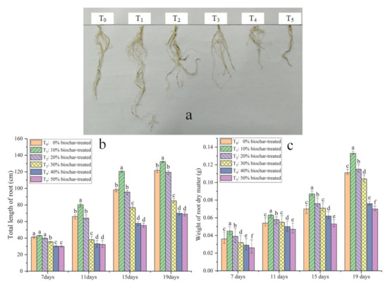 The total length of the root and the weight of root dry matters were two important parameters to judge root growth [34], so we selected these two parameters in order to better describe the effect of substrates with different biochar treatment to root systems. The root systems of the 19-day-old seedlings were washed carefully, and, finally, the roots were put on the paper after excess water of them was absorbed (Figure 3a). We found that the seedling raised in the substrate with T1 treatment got the strongest root system, and the root system of the seedlings raised in the substrate with T0 and T2 treatment were almost the same which were weaker than that in T1 treatment. However, the root system of the seedlings raised in the substrate with T4 and T5 treatment were the worst in comparison with that in other treatments.