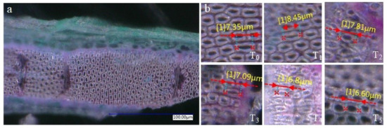 Yang proposed that a certain proportion of biochar-extracted liquor could also promote the length of the cells [34], so we selected some root-tips to measure the length of the cells by using VHX-900F Superdepth Microscope. As shown in Figure 4a, we took the photo of the root-tip cells at the scale of 100 μm, randomly selected the cells from five parts, and measured their average length which was shown in Figure 4b. The seedlings raised in T1 treatment have greatly enhanced the cell length compared with T0 treatment (P < 0.05), and the cell length raised in T2 treatment was slightly longer than that in T0 treatment, but cell length raised in the substrates with T3, T4, and T5 treatment significantly reduced. This test also proved that appropriate proportion of biochar could promote the growth of seedling’s root system.