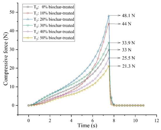 As shown in Figure 6, different proportions of biochar could greatly affect the compressive strength of the substrate. Zhang proposed that the addition of biochar could highly improve the mechanical properties of the compound body [35]; thus, theoretically, adding more biochar could bring better mechanical properties to the substrate, but the mechanical property should be the result of the interaction of substrate and root system.