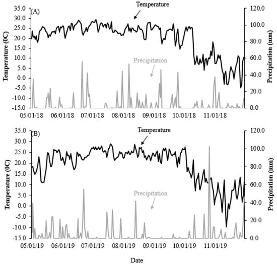 Figure 1. Average air temperature and cumulative monthly precipitation during corn growing season in 2018 (A) and 2019 (B) in Carbondale, Illinois.