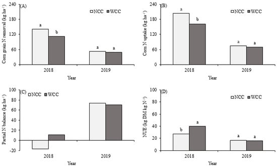 Figure 2. Corn grain nitrogen (N) removal (A); uptake (B); partial N balance (C); and N use efficiency (D) as affected by wheat cover crop (WCC) and no cover crop (NCC) treatments in 2018 and 2019 growing seasons. Different letters indicate significant difference at p ≤ 0.05.