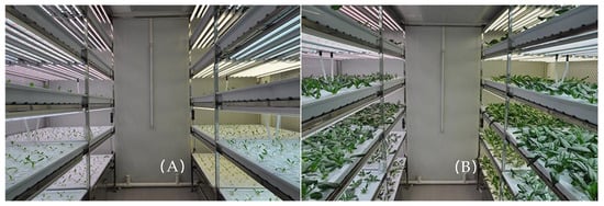 Hydroponic spinach cultivation at 0 (A) and 20 (B) days after transplanting.