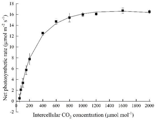 Fourteen days after sowing, spinach seedlings with two expanded true leaves were transplanted to hydroponic cultivation beds (1200 mm × 900 mm × 70 mm) (Figure 1A). Each bed held 54 plants. The air temperature, relative humidity, and nutrient solution at the cultivation stage were controlled at the same level as at seedling stage. Considering the response of net photosynthetic rate of spinach leaves to intercellular CO2 concentration, the CO2 concentration was set at 800 μmol mol−1 in photoperiod (Figure 2). The hydroponic spinach plants were harvested at20 days after transplanting (Figure 1B). The experiments after the transplanting were conducted in three small PFAL rooms located in water college building of China Agricultural University, China.