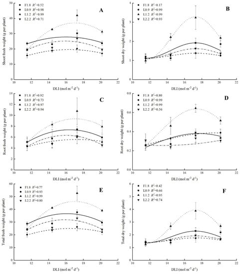 Relationships between daily light integral (DLI) and shoot fresh weight (A), shoot dry weight (B), root fresh weight (C), root dry weight (D), total fresh weight (E) and total dry weight (F)biomass accumulation of hydroponic spinach grown under different light spectra for 20 days after transplanting.