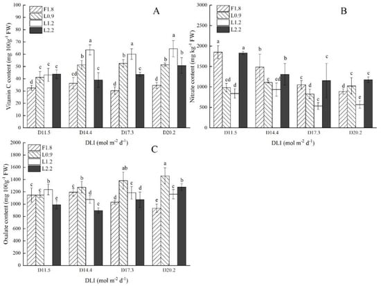Vitamin C (A), nitrate (B) and oxalate (C) contents of hydroponic spinach leaves grown under lighting treatments at four daily light integrals (D11.5, D14.4, D17.3, and D20.2) provided by fluorescent or LED lamps with R:B ratio of 1.8, 0.9, 1.2, and 2.2 (F1.8, L0.9, L1.2, and L2.2), respectively, for 20 days after transplanting. Different letters correspond to significant differences (p ≤ 0.05) by two-way ANOVA with Duncan’s multiple range test (n = 6).