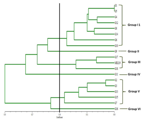Besides days to 50% flowering and number of unfilled grains per hill, all other ten traits showed a positive relationship with the final yield per hectare (Table 5). Highly significant correlation coefficients with yield were discovered in nine traits. days to maturity correlated positively with days to flowering, number of tillers per hill, number of panicles per hill, filled grain, percentage filled grain and thousand grain weight, but had negative association with plant height and unfilled grain. number of tillers per hill had a significant positive correlation with number of panicles per hill, filled grain, percentage filled grains, total weight and yield. panicle length also had a significant positive correlation with unfilled grain, total number of grains, thousand grain weight, total weight and yield, but negatively correlated with percentage filled grain. Filled grain negatively correlated with unfilled grain and thousand grain weight but had a significant positive correlation with total number of grains, percentage filled grains, total weight and yield. The cluster analysis classified the genotypes into six major groups at 0.19 dissimilarity coefficients (Figure 1). This revealed the effectiveness of quantitative/morphologic traits in grouping the rice genotypes. It also showed a high level of morphologic variations present among the assessed genotypes. The largest group was Group I that consist of eight genotypes which are G1, G5, G4, G12, G8, G14, G6 and G10. This was followed by Group V with five genotypes (G2, G3, G13, G15 and G7) and Group III with three genotypes (G17, G18 and MR219). Group II, IV and VI only consist of one genotype in each group (Figure 1).