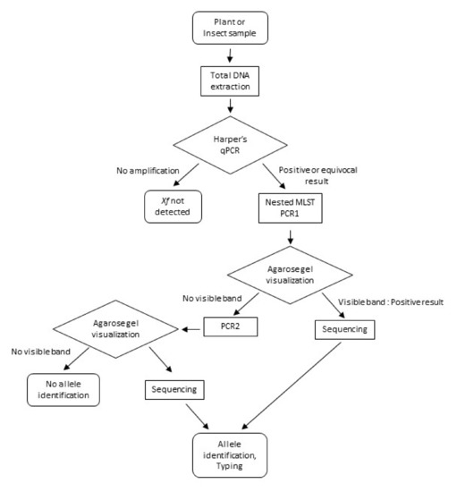 The objective of this study was to improve the published MLST scheme supported by a public website (https://pubmlst.org/xfastidiosa/) by designing nested primers to lower the limit of detection and help in Xf diagnosis and typing. Thus, this improved MLST assay enables a higher sensitivity and specific typing of Xf directly from plant and insects samples without the need of isolating the strain and at an affordable cost.