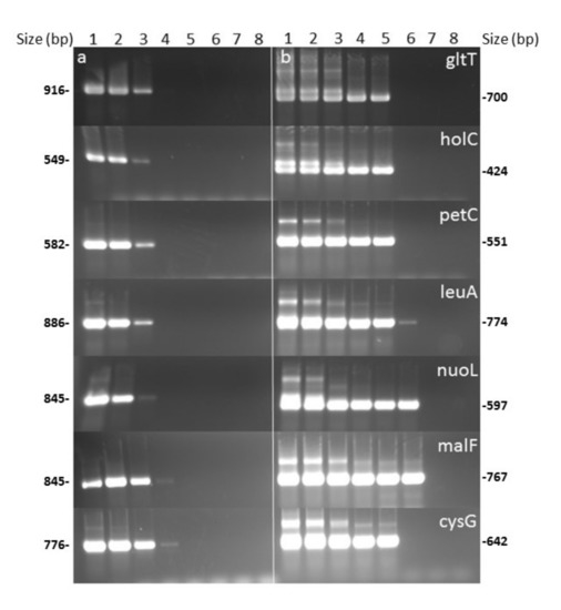 The sensitivity of each primer combination was evaluated on serial dilutions of a genomic DNA solution calibrated (Qubit fluorimeter, Invitrogen) at 220 ng.mL−1 (Figure 2). First round PCRs gave a signal more or less intense for concentrations up to 2.2 ng.mL−1 (0.8 × 106 copies.mL−1) for all HKG except malF and cysG (220 pg.mL−1). The second round of PCRs allowed a sufficiently strong signal for sequencing for concentrations up to 22 pg.mL−1 (0.8 × 104 copies.mL−1) for gltT, holC, petC, leuA, cysG, and up to 2.2 pg.mL−1 (0.8 × 103 copies.mL−1) for nuoL and malF.