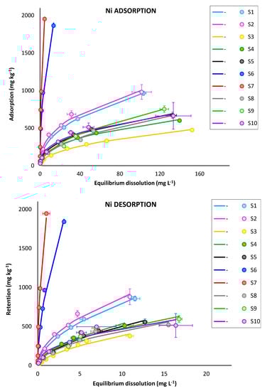 Figure 1 shows the adsorption and desorption curves for Ni in the all ten soil samples (as an example), while for Cu, Zn, Pb and Cr are shown in Figures S1–S4. In all of them, dotted curves show the experimental data while continuous lines show the Freundlich modelled curved. Although most of data fitted well both Freundlich and Langmuir models (except that from S6 and S7 samples), in general, data from adsorption and desorption experiments better fit Freundlich (Table 2) than Langmuir model (Table S1) as was also found by other authors [21]. Most of the determination coefficients (R2) derived from the adjustments to Freundlich models are higher than 0.90 or even 0.95 (Table 2). In most of the 50 fitted curves n Freundlich parameter for adsorption was lower than 0.5 (41 cases) or around this value (2 cases), showing high heterogeneity in the adsorption sites. With the exception of S2 for Pb (n = 0.74) values significantly higher than 0.5 were found for S6 and S7 for Cr and Cu. For Pb adsorption data didn’t fit to Freundlich equation due extremely high adsorption (probably due to precipitation processes). Results from S6 and S7 samples for Cr and Cu show linearity of the adsorption processes or homogeneous sorption sites but also probably revealing irreversible reactions or precipitation for Cu, a probable process due to neutral pH values [29,30]. For most of the cases, the parameter n slightly varies from adsorption to desorption processes, or even remains the same (for Cr experiments) showing consistent pattern for n among adsorption and desorption curves and revealing heterogeneous sites for adsorption and retention after desorption (Table 2).
