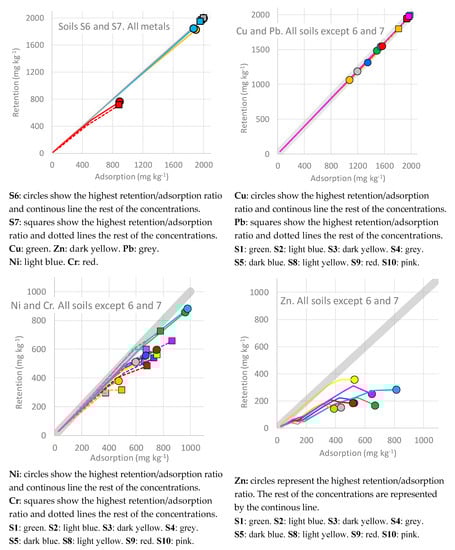 If soils do not release the previously adsorbed cation after desorption experiments, the retained concentration will be equal (or very similar) to the adsorbed one and this will be noticed in the graphs (Figure 2) as that representation will overlap the thick grey line (retention: adsorption, 1:1). If retained concentrations are lower than previously adsorbed (i.e., the soil releases the previously adsorbed cations during desorption experiments) the corresponding representation in the graph will not overlap the grey strip showing up at the lower right of the graph. After representing all studied cases (10 soils and 5 metals) when comparing the concentration retained of each metal versus the adsorbed one several trends where identified. Generally, soils S6 and S7 (pH close to neutral) retained almost all the previously adsorbed amount of metal. The colour lines fitting the grey strip indicate that there is almost not released concentration after desorption experiments. The colour lines (green, yellow, grey, blue and red) indicate the ratio (retained/adsorbed) for each metal concentration (Cu, Zn, Pb, Ni and Cr, respectively) for soil S6 (normal lines) and soil S7 (dotted lines). Circles and squares show the highest adsorbed and retained concentration of each metal in S6 and S7, respectively, which in most of cases are comparable to the parameter β derived from Langmuir model data adjustment (Table S1). This parameter describes the maximum adsorption or retention amounts when the fitting is good. S6 and S7 are in most of cases the soils with the highest β values for Cu, Ni, Zn and Pb adsorption and retention (Table S1) and also those with the highest KF values from Freundlich model (Table 2) as it was already indicated. S6 adsorbs and retains a relative less amount of Ni and Zn than S7 and the concentrations of Cr adsorbed and retained in both soils are the lowest as β (Table S1) and KF (Table 1) also indicate. In addition, when the highest concentration of Cr is added, part of the adsorbed concentration is released after desorption experiments in both soils (the red lines do not fit the grey strip, Figure 2).