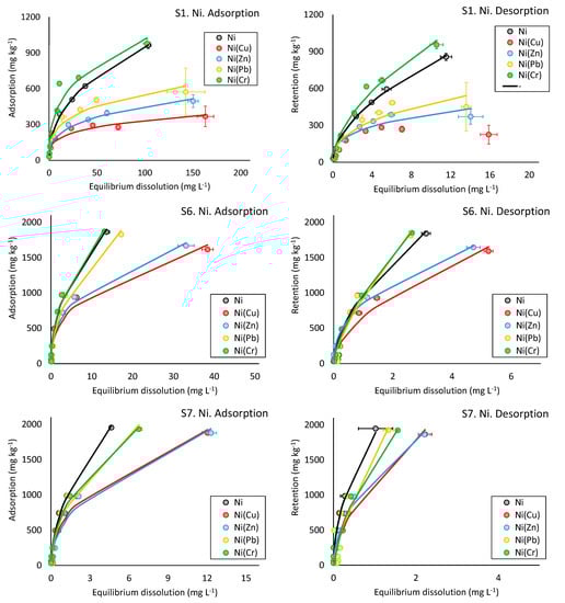 Pair metal competitive experiments were conducted in S1, S6 and S7 samples. Figure 3 shows the adsorption and desorption curves of Ni when one other metal is added during adsorption experiments as well that curve derived from single solution experiments (black lines). The corresponding competitive curves of Cr are shown in Figure 4 and those of Cu, Zn and Pb are shown in the Supplementary Materials (Figures S5–S7, respectively).
