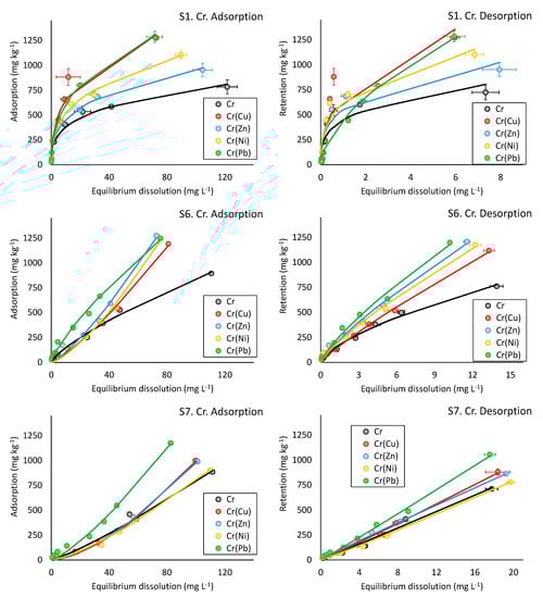 Competitive (coloured) and single (black) adsorption and desorption curves of Cr for soil S1, S6 and S7 samples.