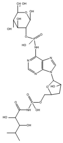 Initially, the inoculant was supplied by the scientific laboratory that isolated K84, but later, a commercial product, containing strain K1026, a modified version of strain K84, was produced [6] and registered as a biopesticide in 1988 (Australia), 2000 (USA) and 2005 (Turkey). Control occurs through the production of an antibiotic, agrocin 84 [7] (Figure 2). It is an adenine nucleotide with two substituents, one of which controls uptake and the other, toxicity [8]. Agrocin 84 prevents protein synthesis by inhibiting the essential enzyme leucyl tRNA synthetase [9,10].