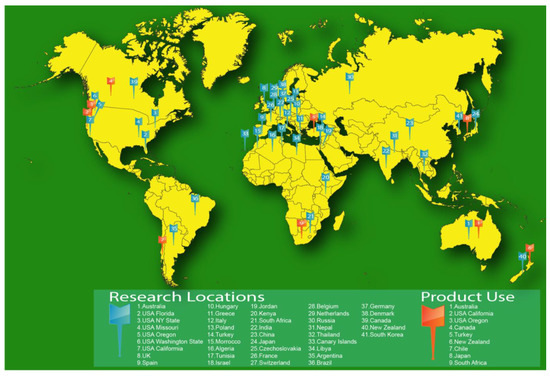Research institutions, with biocontrol technologies ready for the market, ultimately need to go through the process of linking their research to commercial partnerships, often with small–medium sized enterprises (SME). In the case of Rhizobium rhizogenes, strain K84, cultures were provided “free-of-charge” during 1973–1974 to anyone that wanted to test or commercialise the bacterium. By 1974, two companies in Australia had started producing pure cultures of K84 as either agar cultures in Roux bottles or pure, peat-based inoculants for supply to nurseries across Australia. Cultures were also sent to colleagues in various parts of the world during the 1970s with no contractual agreements. No patents were ever applied for on K84 or its use, so it was publicly available. During the following years from the initial release of K84, several researchers outside Australia tested K84 and/or K1026 against local, pathogenic Agrobacterium in various countries in the world (Figure 4).