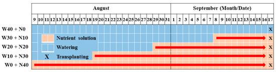 The five treatment groups were set by the different nutrient solution resupply periods (Figure 1). The nutrient solution resupply period was divided into increments of 10 days during the 40-day treatment period. W40 + N0 (control, 40 days of tap water only), W30 + N10 (30 days of tap water and 10 days of nutrient solution), W20 + N20 (20 days of tap water and 20 days of nutrient solution), W10 + N30 (10 days of tap water and 30 days of nutrient solution), and W0 + N40 (40 days of nutrient solution only) were set and started on 9 August 2019 and ended on 17 September 2019.
