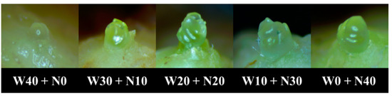 As shown in Table 1, 10 days before transplanting, flower bud differentiation showed no significant differences between all treatments except for W20 + N20, where the group featured more developed flower buds at Stage 2.2 compared to the other treatments. On the day of transplanting, W20 + N20 and W10 + N30 had significantly high developed flower bud stages at 5.5 and 5.1, respectively (Table 1 and Figure 2). Additionally, W40 + N0 had a significantly low developed flower bud stage at 2.4. When flower bud differentiation starts, the nutrient solution supply can help the development of flower buds [20,21]. It has been reported that additional nitrogen can bring forward the date of strawberry (cv. Ai-Berry) flower bud development by about 7 days [23]. However, if strawberries receive continuously high nutrition, this can delay flower bud differentiation [24,25]. The reason for this is the distribution of assimilation products, where too much nitrogen promotes vegetative growth, caused by most assimilation products being used for protein synthesis, and too little nitrogen induces poor growth in plants [10]. When nutrient supply was significantly reduced, the flowering rate did not increase [26,27]. Consequently, the W20 + N20 treatment was considered advantageous for the flower bud development of “Maehyang” strawberries.