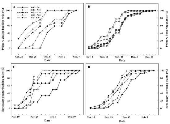 The budding ratio and flowering plants of the primary and secondary inflorescences are shown in Figure 3. The primary budding occurred first in the W20 + N20 group before 22 October 2019. The W20 + N20 and W30 + N10 groups achieved the first 100% primary budding rate on 30 October 2019 (Figure 3A). The first primary flowering plants belonged to the W20 + N20, and W30 + N10 groups, and this occurred on 4 November 2019. Additionally, the W20 + N20 group featured the first 100% primary flowering plants, which occurred on 28 November 2019 (Figure 3B). The W20 + N20 group featured the most developed flower bud just before the day of transplanting (Table 1). Unlike the W40 + N0 (which had a high C/N ratio but was low in other essential minerals) and W0 + N40 (which had a high nitrogen content and a low C/N ratio) groups, the W20 + N20 group was positioned in the middle of the range of element contents (Table 2). The secondary budding ratio occurred first in the W20 + N20 group before 19 November 2019. However, the W30 + N10 group achieved the first 100% secondary budding ratio on 3 December 2019 (Figure 3C). Secondary flowering plants were found first in the W20 + N20 group before 1 December 2019. However, the W30 + N10 group found the first 100% secondary budding ratio on 18 January 2020 (Figure 3D). For the secondary inflorescences, the effect of the nutrient solution resupply period seems to be relatively low; however, some nutrient solution resupply period groups (W30 + N10, W20 + N20) had a better budding ratio and flowering of plants than the W40 + N0 and W0 + N40 groups. It is known that fast flowering induces an early harvest. In the winter season (November to January), when strawberries are most expensive in the Republic of Korea, early harvested fruit can provide greater price competition [3,45]. Therefore, the W30 + N10 and W20 + N20 groups can support early harvests in order to increase the price competition of strawberries for farms and suppliers.