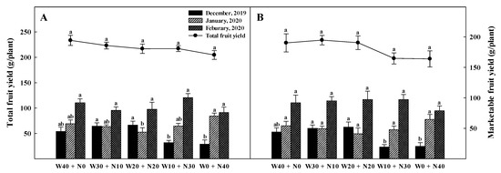 The fruit yield in December significantly decreased when the nutrient solution resupply period increased above W10 + N30 (Figure 4A). Excess nitrogen can inhibit flower formation and fruit yields [6,56]. There were no significant differences in the fruit yield in February and the total fruit yield. The marketable fruit yield was not significantly different between all treatments except in December (Figure 4B). This is similar to previous research that controlled the nutrient solution supply timing of strawberry runner plants [8,54]. The total fruit yield of strawberries shows a low level of interaction with the supply timing of the nutrient solution and is highly influenced by the concentration of the nutrient solution [57].